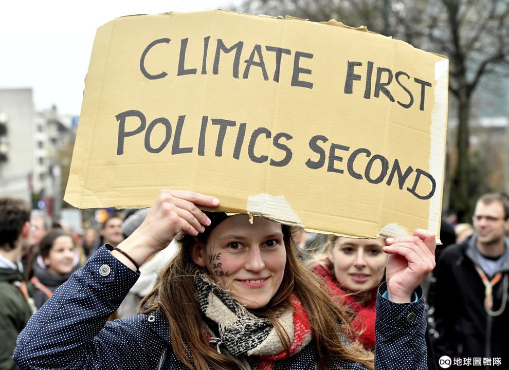 本月 2號,當會議COP24在波蘭展開時,數以萬計的民眾聚集到歐盟位於比利時的總部抗議,呼籲當今政府重視全球暖化議題。畫面中女子拿的標語寫到「氣候第一、政治第二」。
