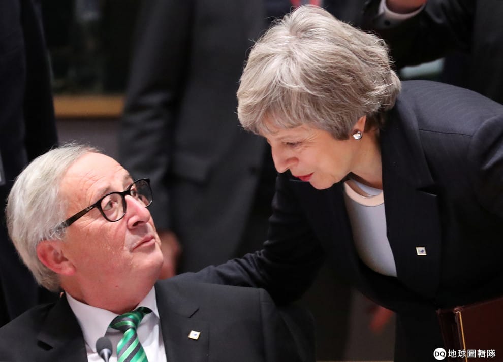 在 13號的歐盟領導人峰會上,梅伊正在和歐洲聯盟執行委員會主席榮科談話。