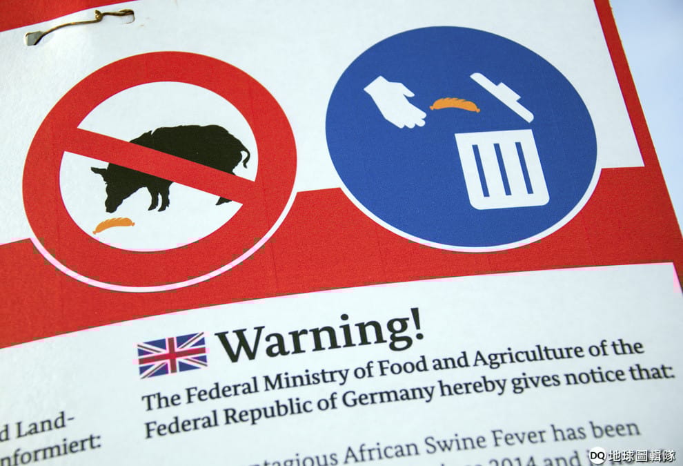今年 2月在德國某處的高速公路上,德國聯邦食品及農業部用不同的語言提醒大眾注意非洲豬瘟,提到這種病毒可以透過食物傳染。