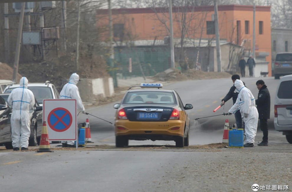 今年 11月在中國,工作人員穿上防護衣,在檢驗出非洲豬瘟的農場附近進行嚴密的消毒作業。