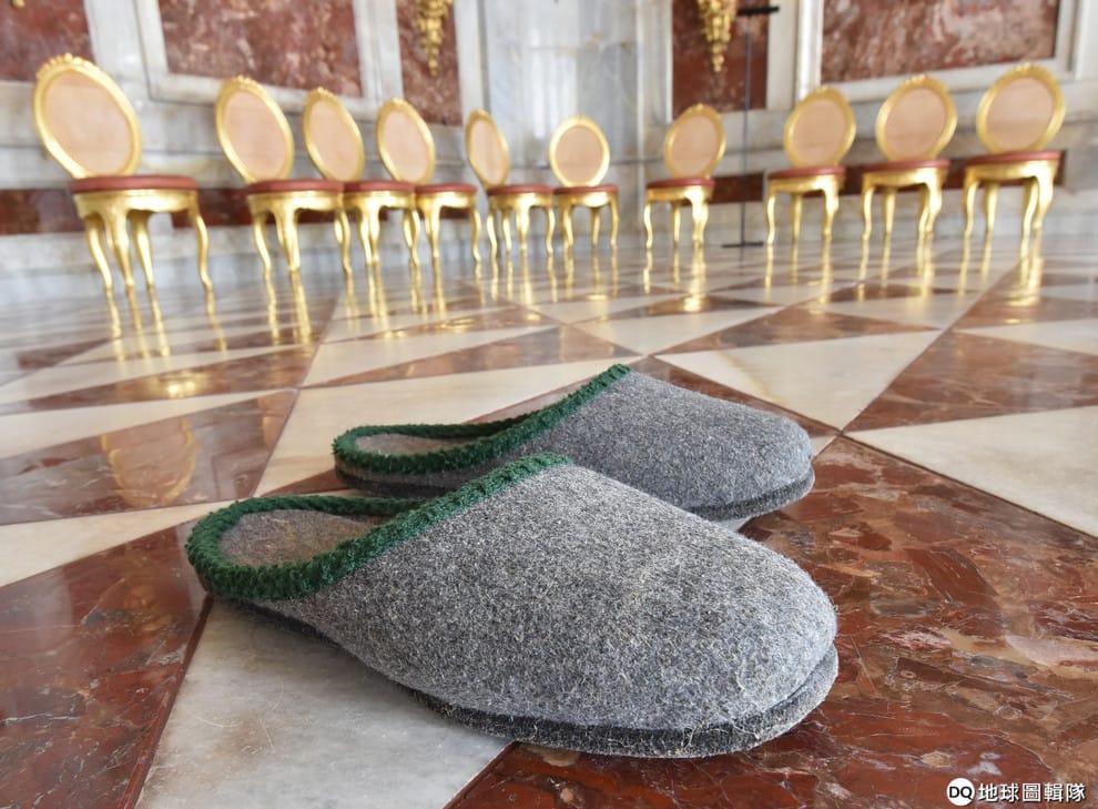 圖為 2016年4月,在德國波茨坦(Potsdam)Neue Kammern宮殿裡,擺出了一雙拖鞋供民眾使用。
