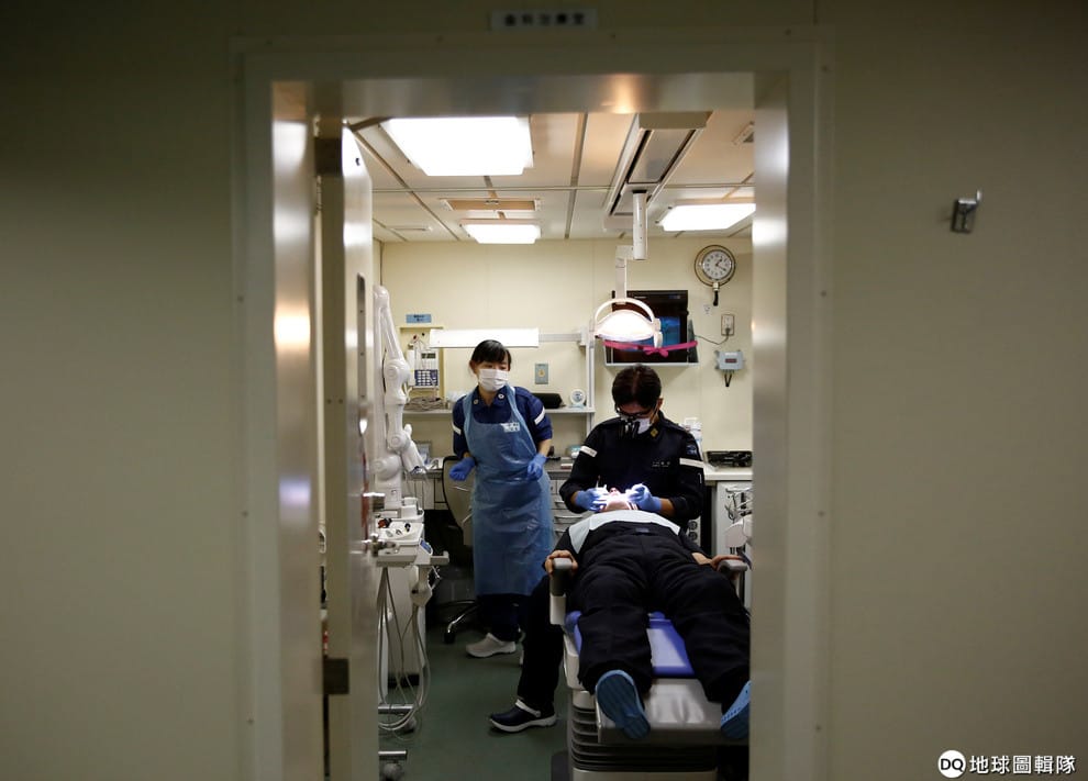 在加賀艦上的醫護室內,一名護理師正在協助船上的牙醫治療病患。
