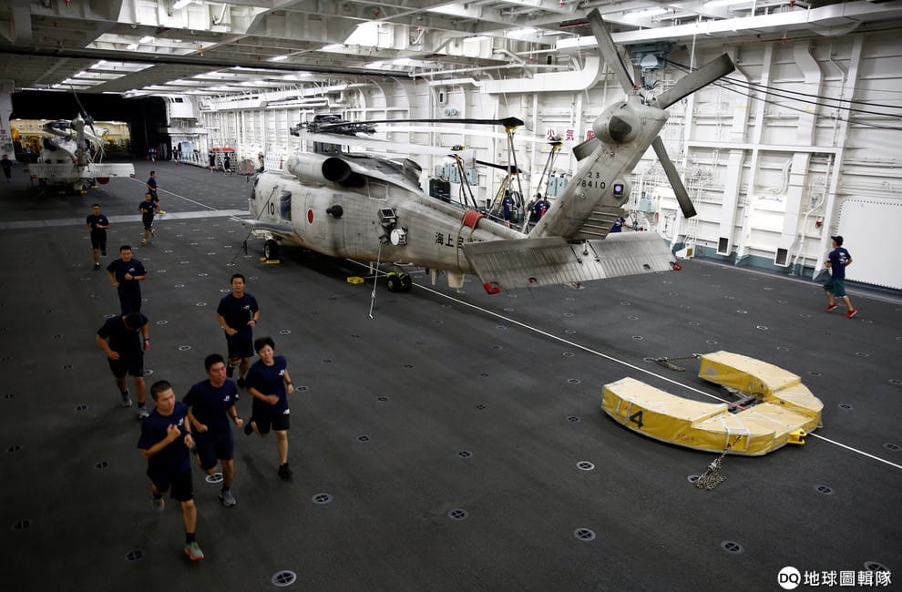 路透社 / 達志影像在加賀艦的機庫甲板上,一名女性直升機維修專員拿著器具走過她的男同事。