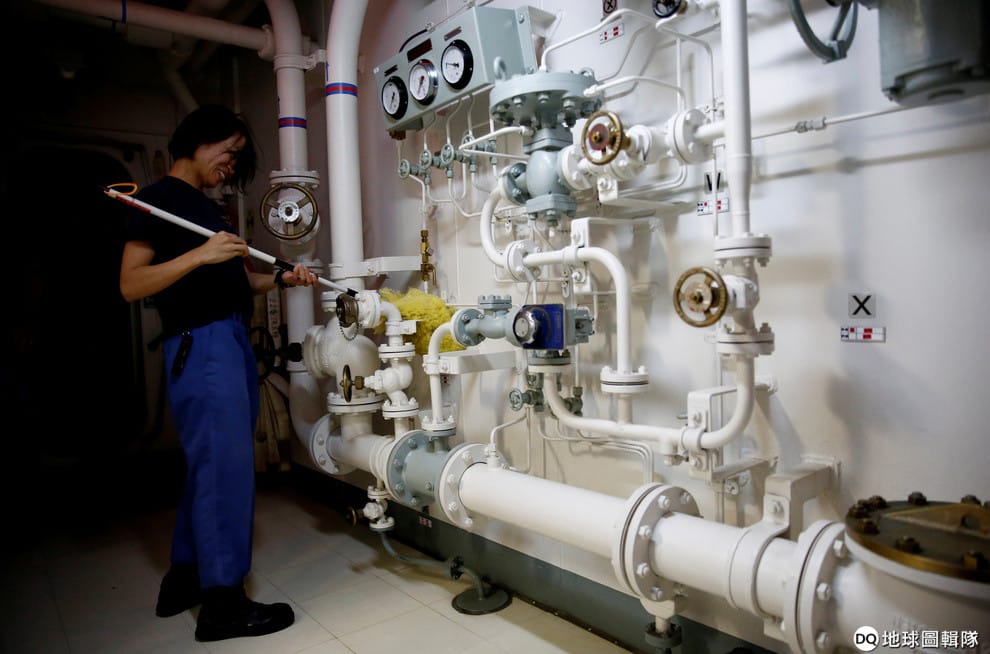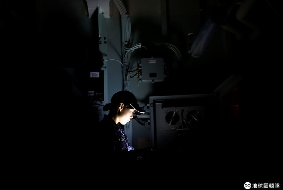 路透社 / 達志影像一名加賀艦上的IT專業技師正在檢查通訊纜線。比起航空和陸上自衛隊,海上自衛隊要招人更加困難,因為在海上出任務時一律不得使用像IG、Facebook等社群媒體。