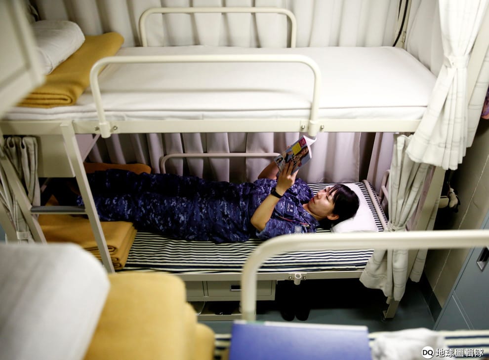 適逢午休時間,一名女水手在寢室內看書休息。在船艦上,水手們不太能使用網路對外聯絡。