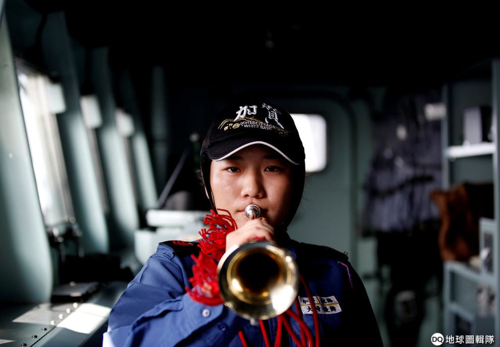 日本加賀艦領航員大崎優舞準備吹響號角,通知船上的大家整艘船艦要往印度洋前進了。