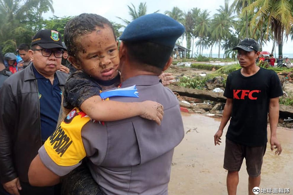圖為 23號,在印尼萬丹省,一名員警抱著一名剛獲救的小男孩。