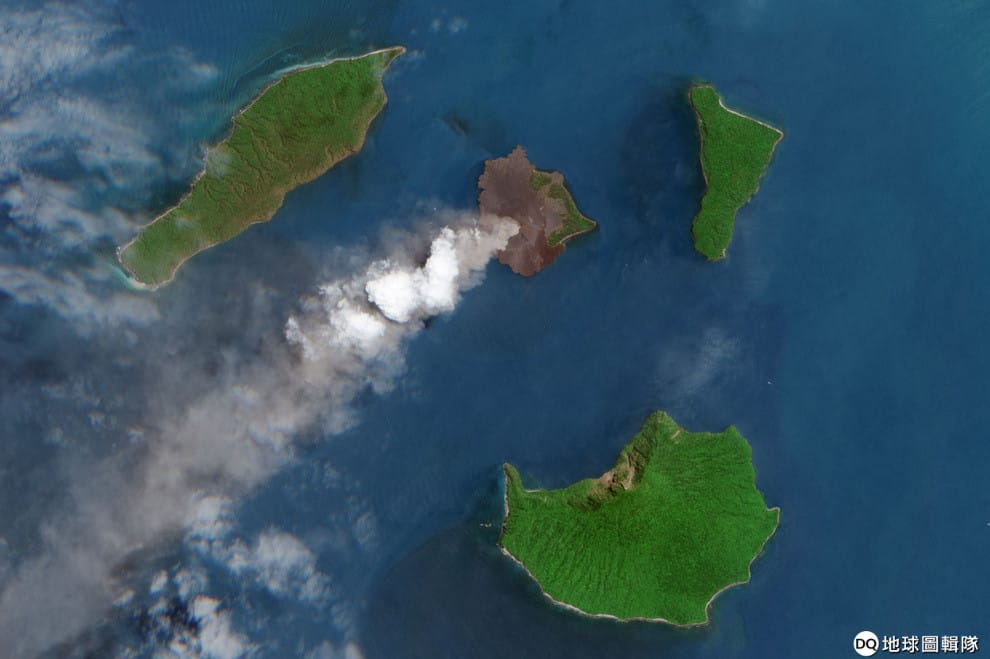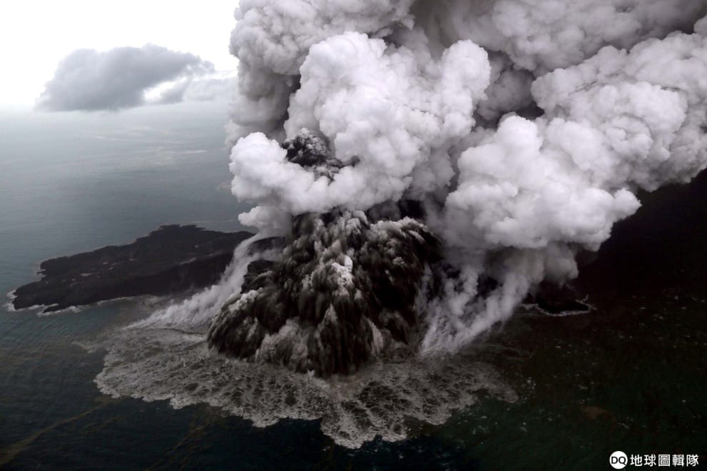 圖為 23號「喀拉喀托之子」火山的空拍圖。「喀拉喀托之子」火山在前一晚,因為火山山崩,造成大量落石滑入巽他海峽而引發海嘯。