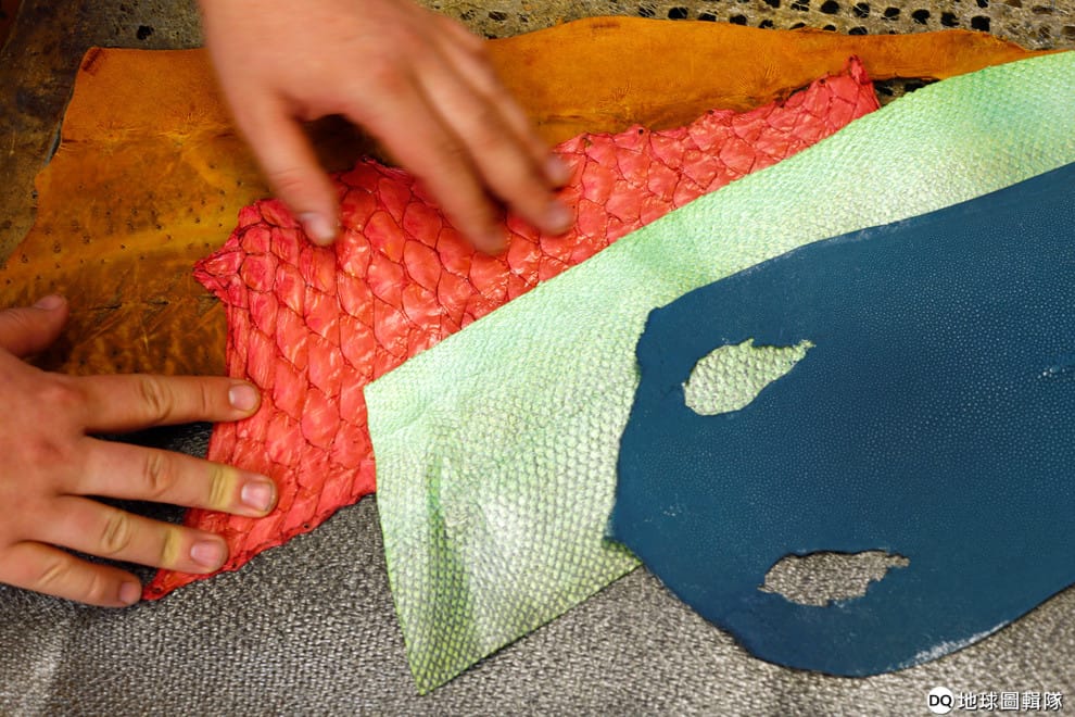 在德國鞋匠科佩茨的工作坊裡,有著各式各樣的「魚革」,從左到右分別是鸚哥魚、鮭魚和鰩魚(skate fish)製成的魚革。
