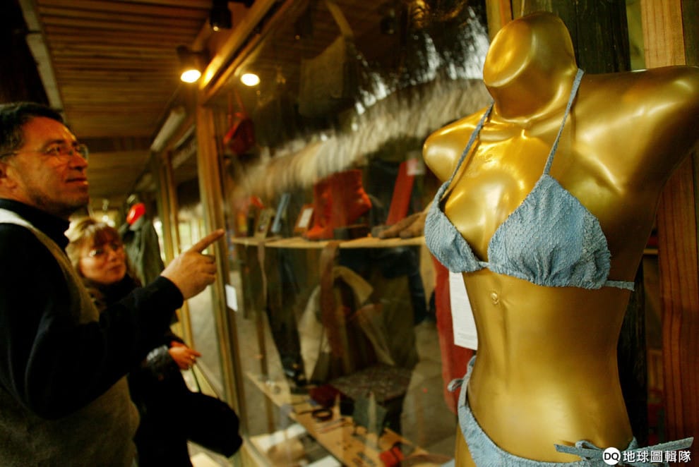 圖為 2003年8月,在智利首都聖地牙哥(Santiago),遊客們在一間「魚革」製品專賣店的櫥窗前停了下來。