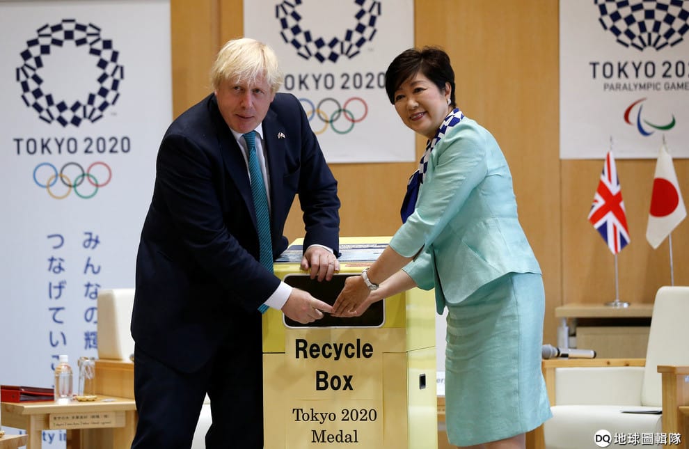 圖為 2017年7月,時任英國外交大臣的強生(Boris Johnson)出訪日本時,他也和東京都知事小池百合子一同響應 2020年東京奧運的「都市礦山」做獎牌計劃。