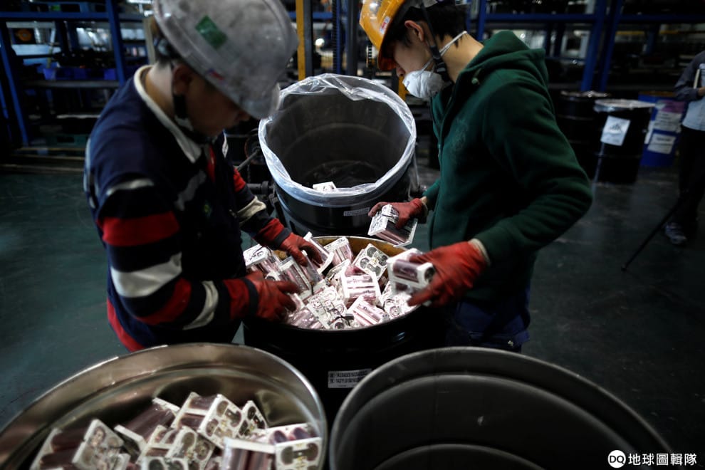 圖為今年 4月,在南韓群山市的「都市礦山」裡,工人們皆戴上口罩和手套,整理著檯面上的廢電池。