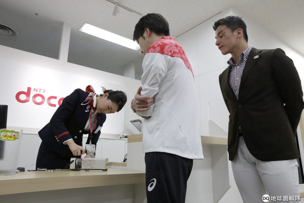 路透社 / 達志影像圖為 2017年4月在日本東京,奧運游泳選手松田丈志(右)和殘障奧運游泳選手山田拓朗(中),看著在一名NTT Docomo電信行的門市小姐如何將一支舊手機報廢。