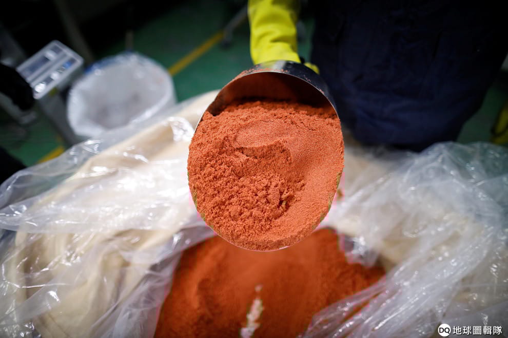 「都市礦山」的工人們鏟起一大匙紅棕色的硫酸鈷粉末,這些粉末都是由「礦產」提煉而成的。