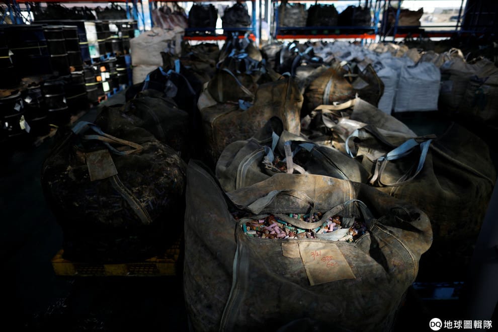 圖為今年 4月,在南韓群山市(Gunsan)的一座「都市礦山」,可以在「礦場」看到一袋袋的廢電池聚集於此。