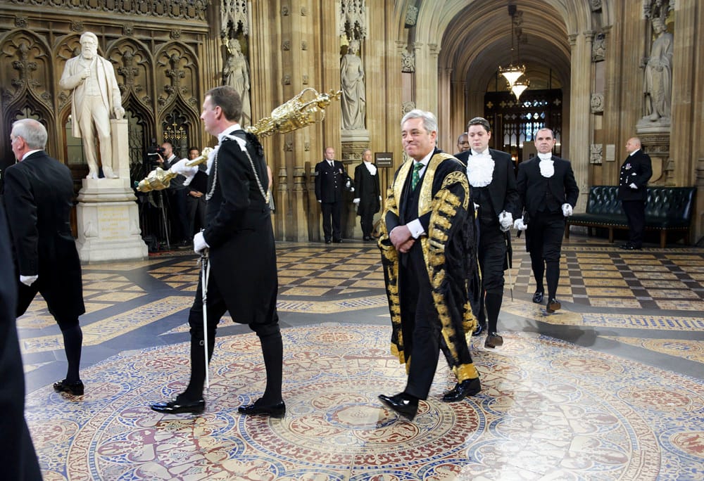 2014年6月,議會警衛官扛著權杖準備進入下議院,披著長袍的則是議長貝爾考。