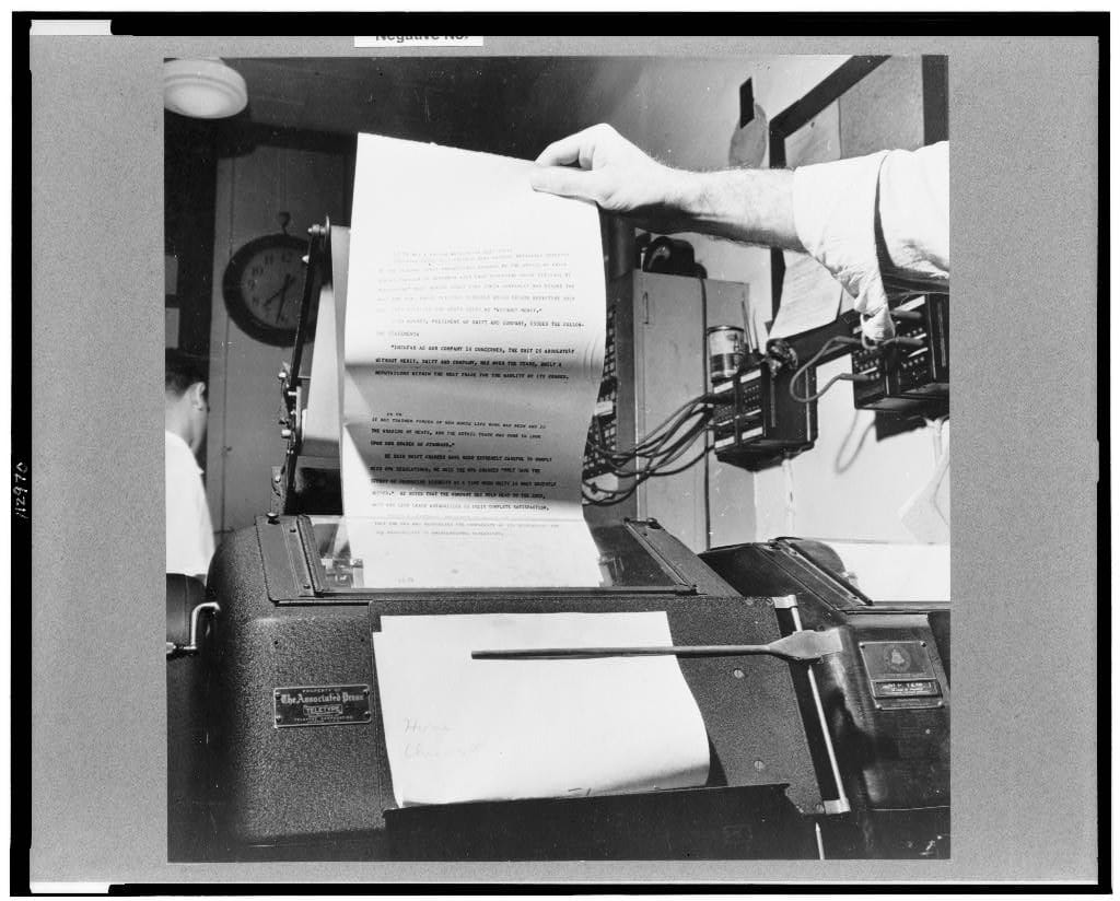美聯社 / 達志影像換個角度來看,來到《紐約時報》的傳真室,當時的人們就會像這樣收到《美聯社》的新聞訊息。圖拍攝於 1942年1月。