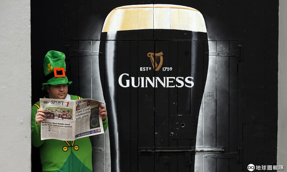2015年3月在北愛爾蘭城市德里(Londonderry),一名打扮成愛爾蘭矮妖的男子正在讀報紙。