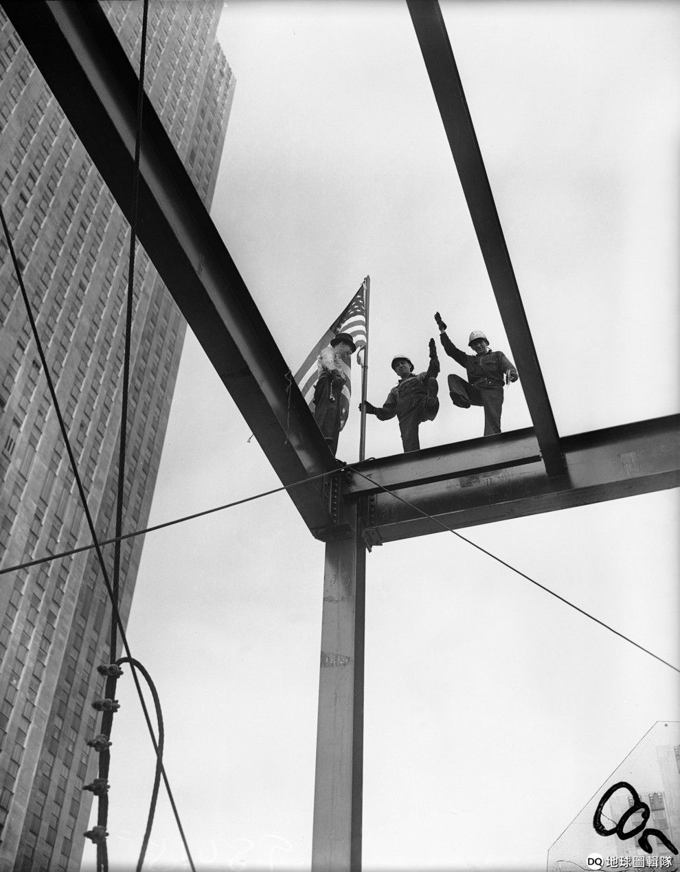 美聯社 / 達志影像在「落成」典禮上,工人們興奮地在建築最高處擺上美國國旗,標誌著他們已經完成這棟建築的鋼筋工程,這時候是 1938年6月。
