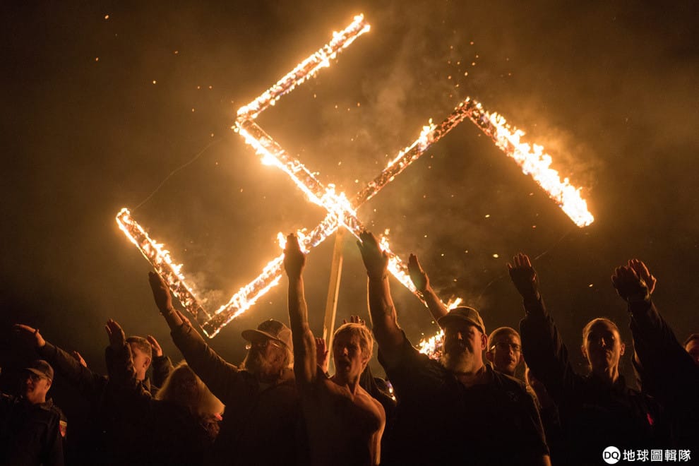 大概在幾個小時後,我們一起到某個酒吧的後院,在那裡,我們看到了一個大大的木製納粹黨徽被擺在地上,然後大概有 15個新納粹的成員在點燃它後行納粹禮。