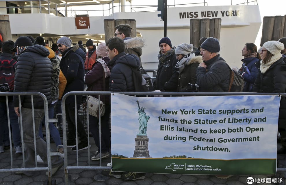 圖為上個月 27號,民眾排著隊伍準備登上開往自由女神像的船。一旁的欄杆上掛著一面旗子,上面寫到在美國政府停擺期間,紐約州政府會持續金援自由女神像和埃利斯島,讓民眾可以參觀。
