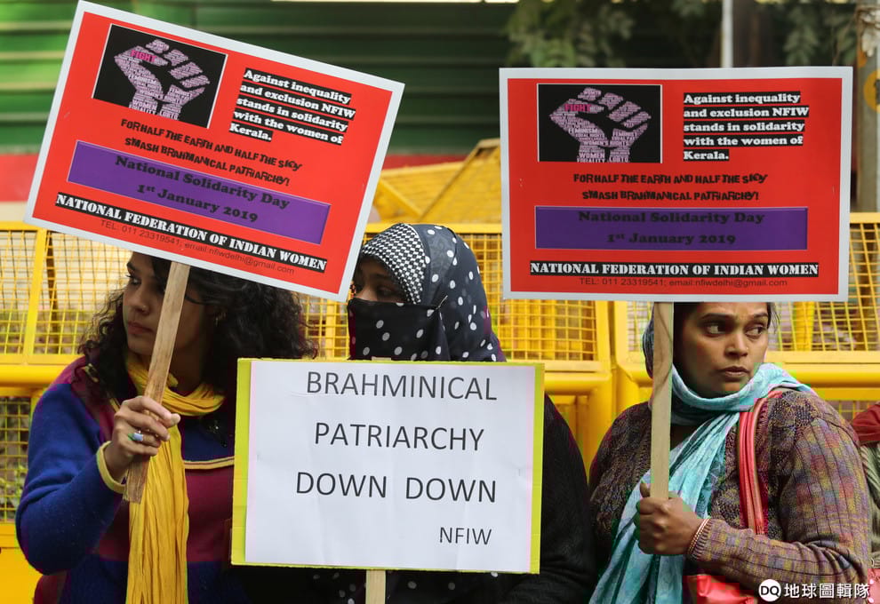 圖為今年元旦,印度首都新德里(New Delhi),民眾舉著反對不平等牌子,聲援南部喀拉拉邦的「婦女圍牆」運動。
