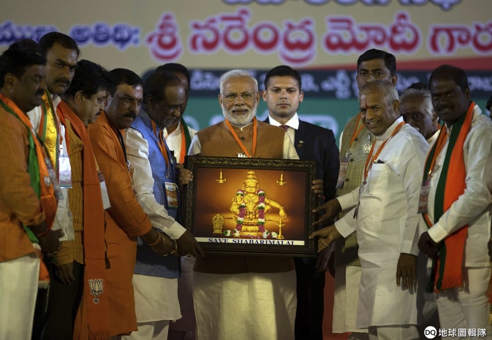 圖為去年 12月,在印度第四大城市海德拉巴(Hyderabad)的選舉造勢活動上,總理莫迪手持著民眾致贈的阿雅潘畫像,底下還印著一排「拯救沙巴瑞瑪拉神廟」(Save Sabarimala)的文字。