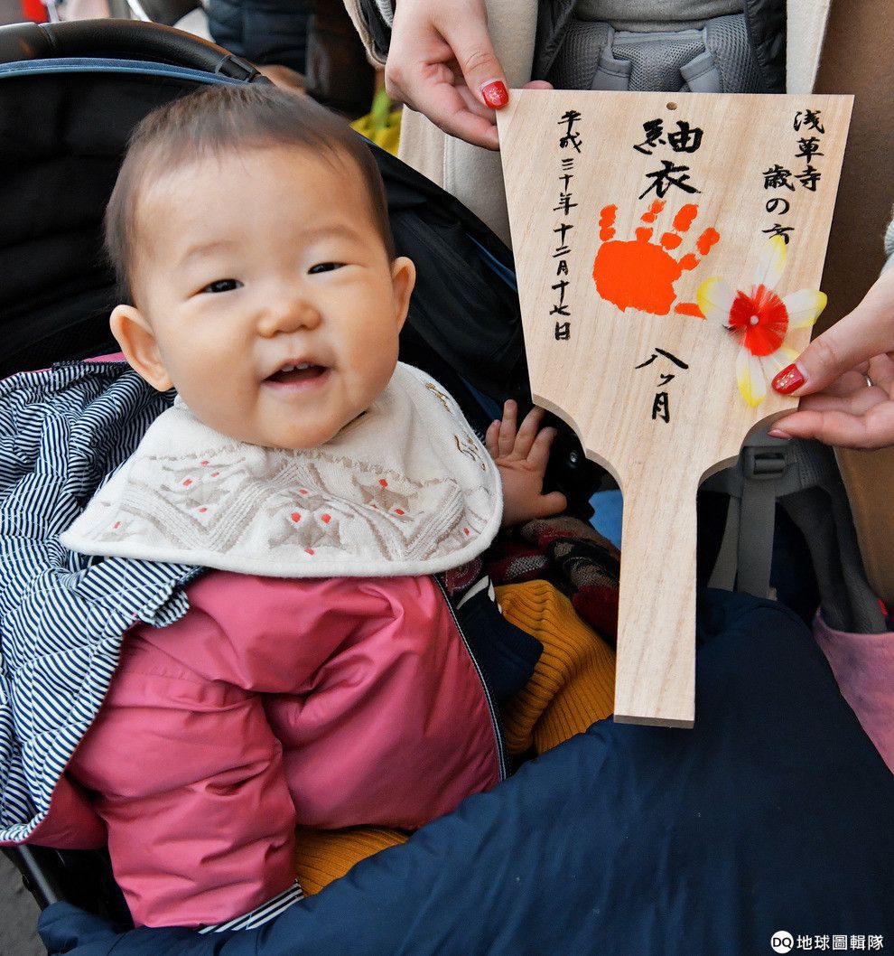圖為 2018年12月,在日本東京淺草寺,8個月大的袖衣和一塊寫有她的名字和手印的羽子板合影。