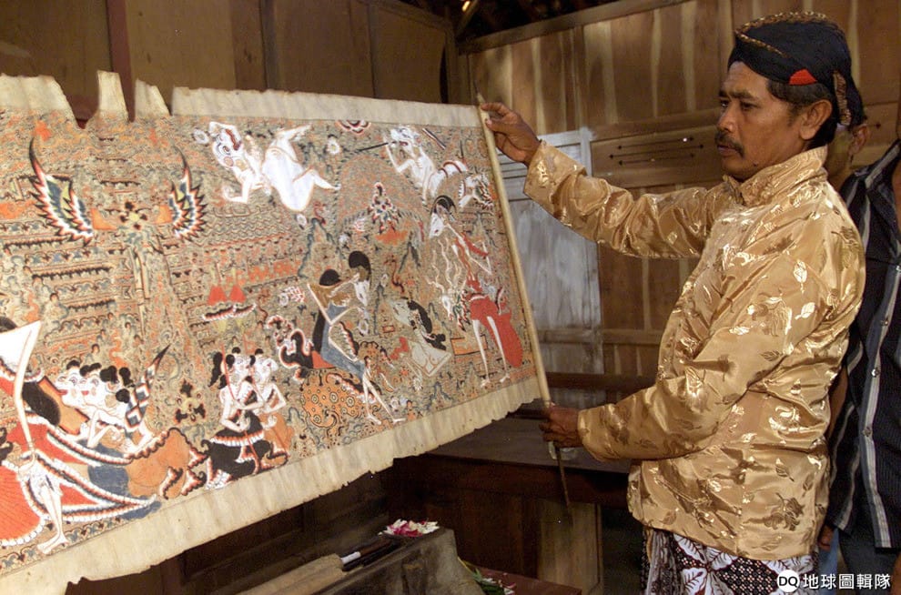 圖為 2005年8月,在印尼日惹(Yogyakarta)的Gelaran村,一名藝術家展示著一幅描繪印度史詩《羅摩衍那》和《摩訶婆羅多》故事的作品。