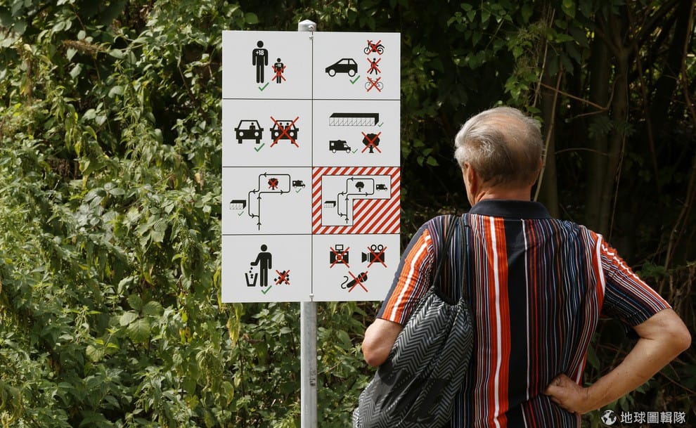 性交易專區旁的告示牌前,男子正細細研究中。標記滿滿的規範的告示牌上,其中的規範例如「每車一人,不能是腳踏車或摩托車,不能錄影,還有不能亂丟垃圾」。(Just one man per car, no bikes or motorcycles, no filming, and of course no littering.)