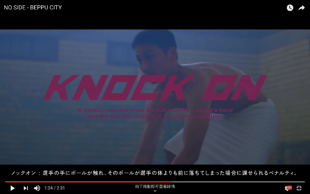 網友 別府市国際スポーツキャンプ誘致推進室向前掉球(knock on):球員碰到球後,球落地,而且球落地的位置又在該名球員前方,在橄欖球賽中屬於犯規。在「NO SIDE - BEPPU CITY」的影片中(1分17秒處),圍著浴巾的「選手」碰到木桶後,一時手滑讓木桶落地,此時在浴場裡出現一名裁判吹哨,判這名「選手」違規。