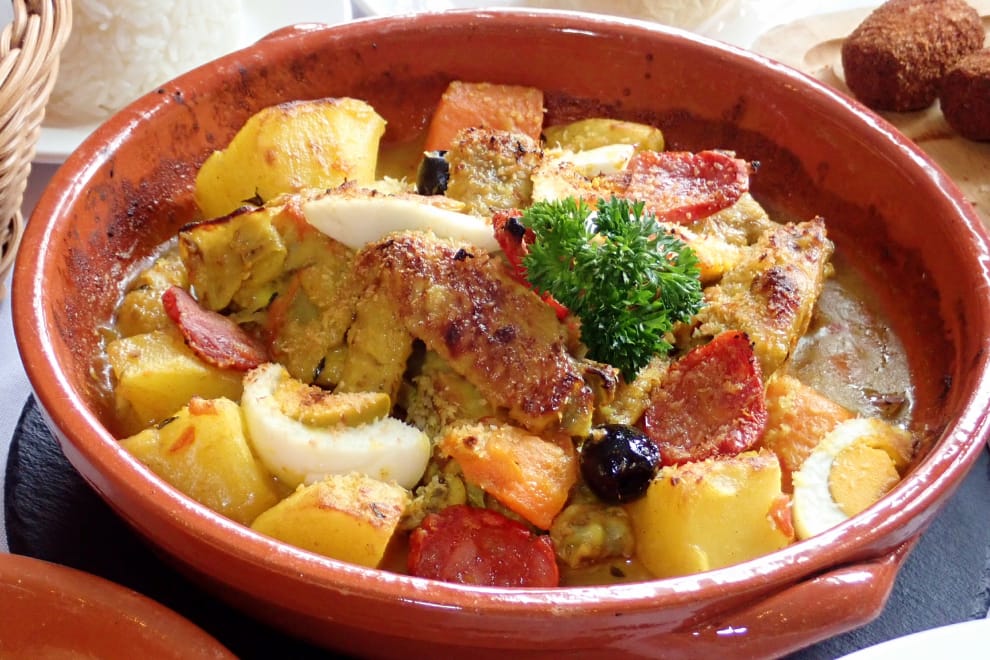 圖為在澳門節慶場合或一家人團圓時,一定會出現的土生葡菜「大雜燴」,裡頭的食材和調味料融合了東西方的特色,是別具風情的一道菜餚。
