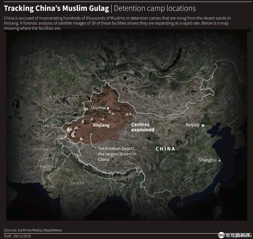 圖為路透社透過衛星圖,推估新疆現在 39個新疆集中營的所在位置。他們相信這類機構正以非常快的速度擴展著。