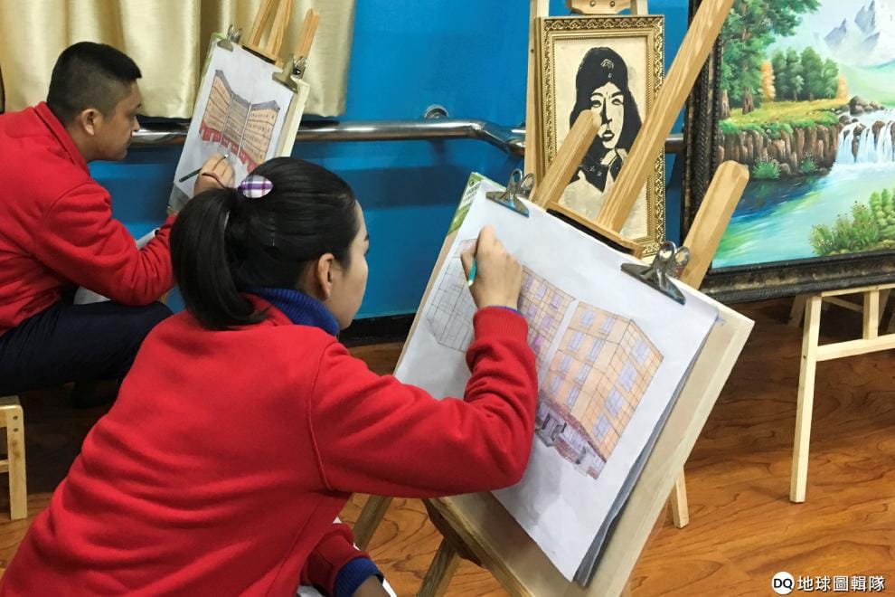 在墨玉縣的再教育機構一角,人們正在上美術課。