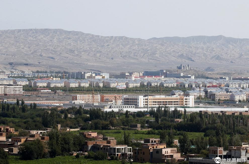 圖為《路透社》拍攝於 2018年11月29日的照片。隔著圍牆,可以很清楚地看到再教育中心的樣貌,以及位於畫面最左側和最右側的警衛塔。
