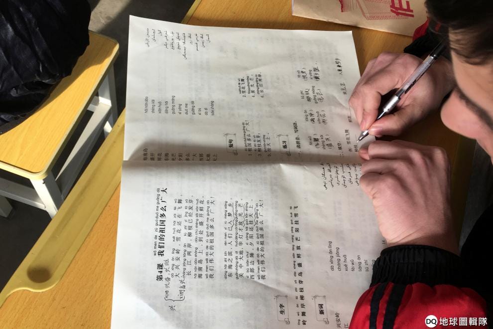 在其中一間教室裡,台上的老師正在用中文解釋道,如果人們不允許他人在婚禮上歌舞、在葬禮上哭泣,那就是極端思想的表現——台下的學生們則專心地做著筆記。