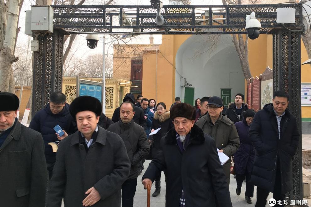 行程中也包含了拜訪清真寺,畫面中穆斯林和政府官員一同經過被安置大量監視器的入口處。