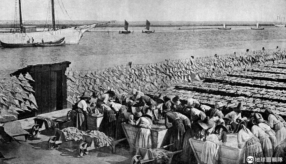 圖為 1882年的木刻板畫,圖中描繪了人們將紐芬蘭島海域捕到的鱈魚風乾的過程。