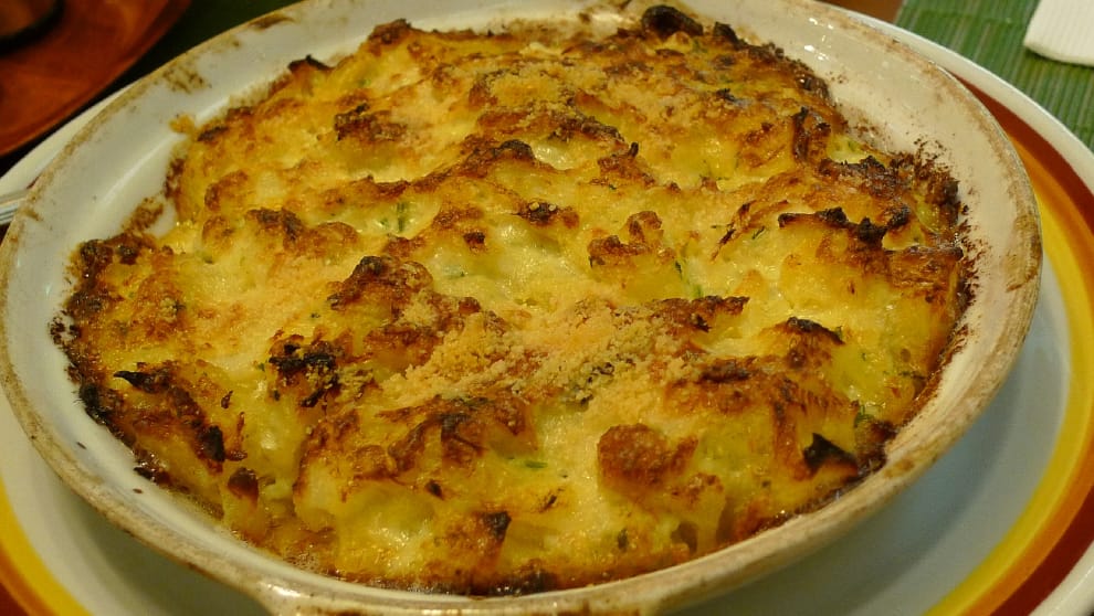 再來,第二道令人更開胃的馬介休料理是「忌廉焗馬介休」(Bacalhau com Natas),這裡的忌廉指的是鮮奶油,顧名思義就是把馬介休切成小塊後,混合鮮奶油、馬鈴薯泥、洋蔥後,再鋪上起司絲,放進焗烤盤中送入烤箱就大功告成了。