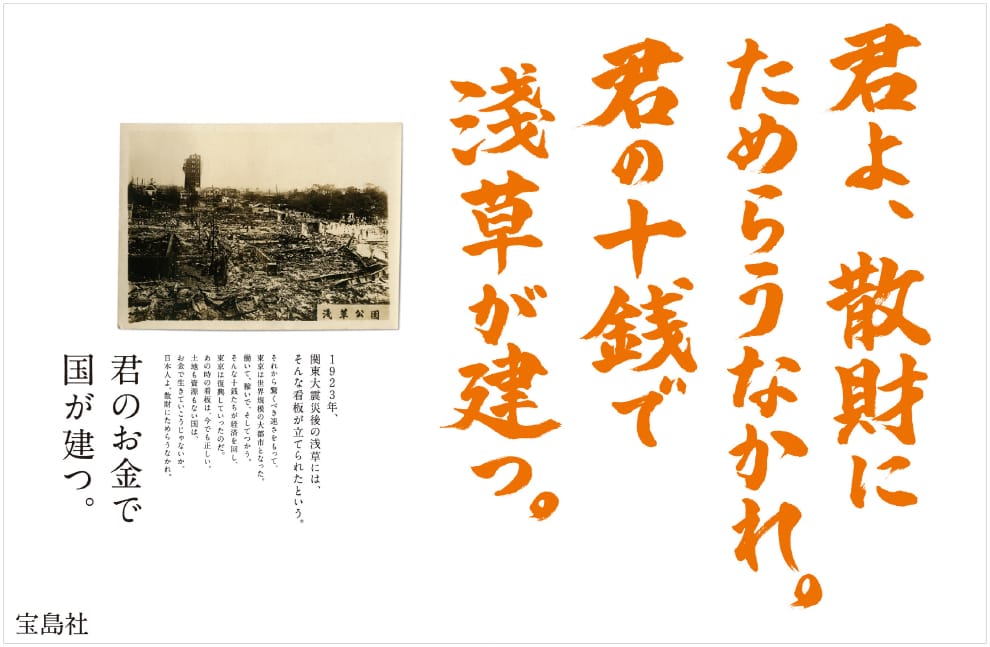 「1923年,關東大地震後的淺草隨處可見這樣的看板」,當時的物價一份炸豬排只要 20錢,寶島社寫到:「這些 10錢讓經濟復甦,振興東京,當時的看板拿到今年來看也是正確的。在沒有土地和資源的國家,只能靠著錢滾錢」、「你的錢可以振興國家。」