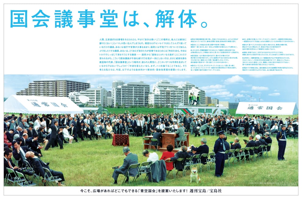 但如果大家只是單純否定國會,並不會有所改變,所以「週刊寶島和寶島社提案,從現在開始,哪裡有廣場,哪裡就可以是『青空國會』(編註)!」
