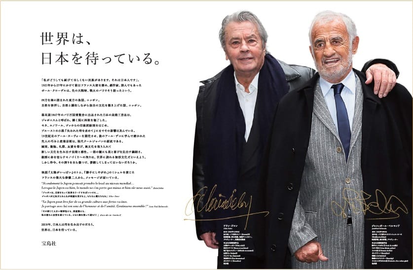 寶島社便邀請到法國名演員亞蘭·德倫(Alain Delon, 圖左)和尚-保羅·貝爾蒙多(Jean-Paul Belmondo, 圖右),分別留下一段話給日本。