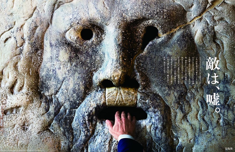 至於刊登在《讀賣新聞》和《日刊現代》全國版的〈謊言就是敵人〉,畫面上遠看是一隻手深入義大利羅馬希臘聖母堂著名的「真理之口」(Bocca della Verità),在標題〈謊言就是敵人〉旁邊的文字則寫到: