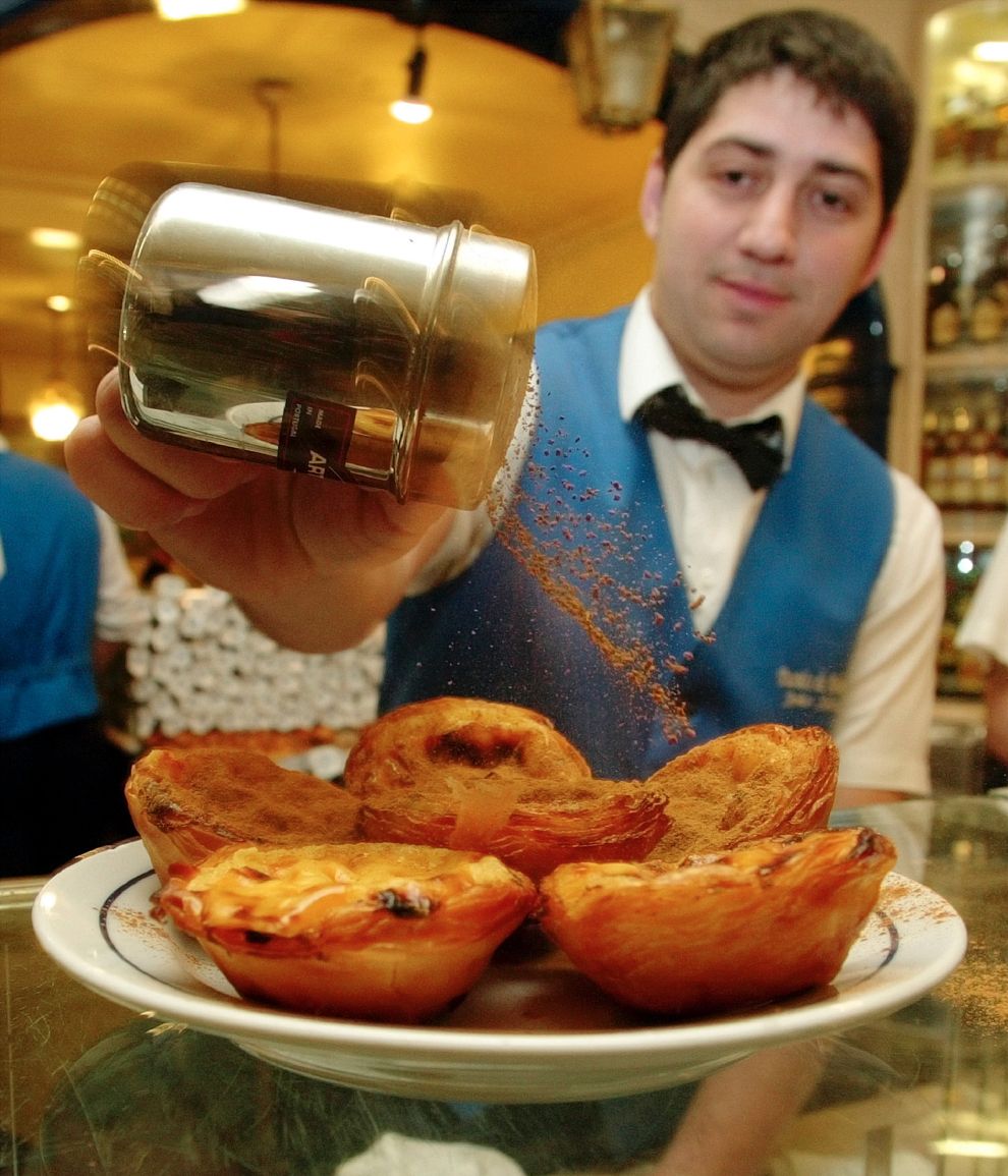 乍看之下,丹麥這項傳統就像是印度彩粉節,不過它只涉及了一種顏色、還充滿了濃烈的味道。圖為 2004年在葡萄牙,服務生正在幫蛋塔灑上肉桂粉。
