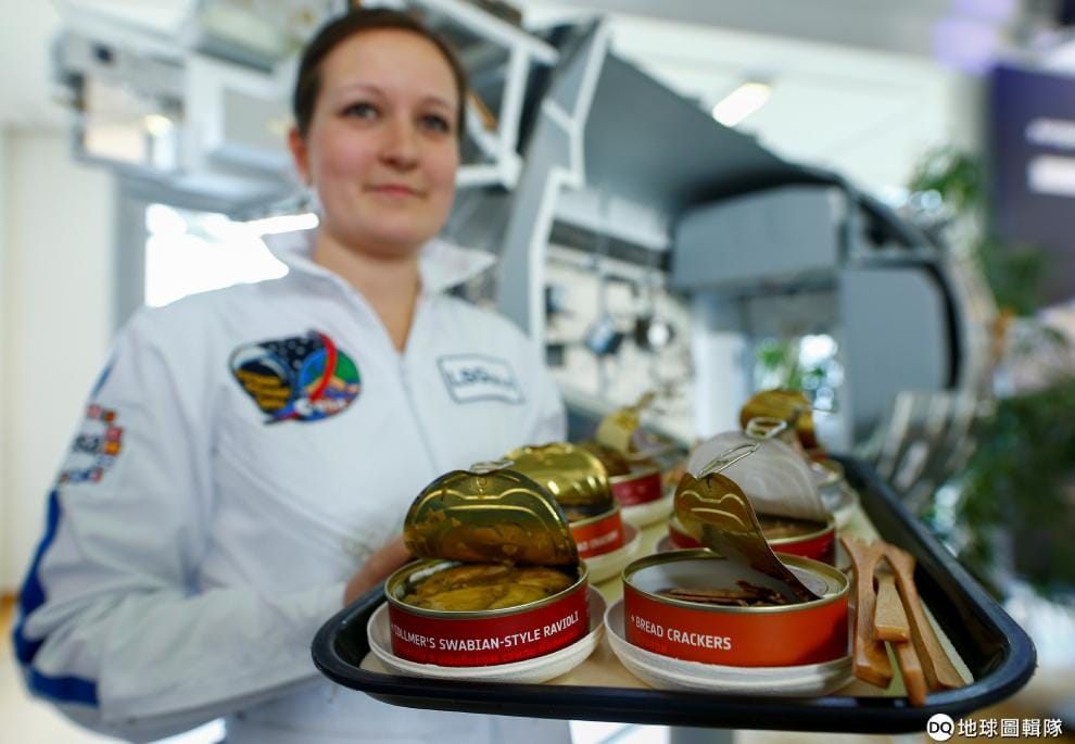 圖為 2018年3月,在德國科隆(Cologne)的歐洲太空總署(European Space Agency, ESA)的歐洲太空人中心(European Astronaut Centre),一名工作人員向鏡頭展示太空食物罐頭。