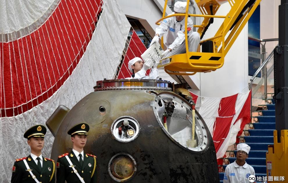 圖為 2016年11月,在中國北京,研究人員從神舟十一號太空船當中取出物品。