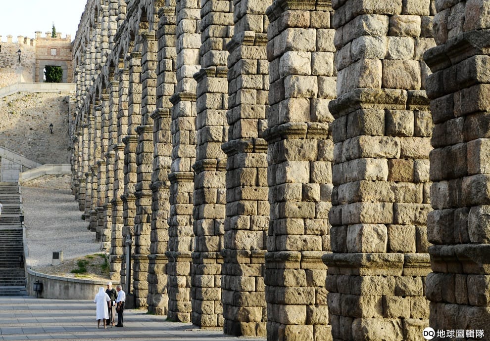 圖為 2018年8月,在西班牙塞哥維亞著名的羅馬水道橋旁邊,民眾和高聳的水道橋形成強烈的對比。這座水道橋在 1985年被聯合國教科文組織(UNESCO)列為世界遺產。
