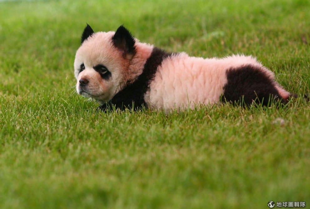 2010年當時,位在河南省的大河民粹公園要替新開幕的寵物公園造勢,特地在當地的寵物市場買來4隻染色的狗狗,原本應該是棕褐色的鬆獅犬,全成了貓熊的外貌。照片中的小動物不是甚麼貓熊,而是被特意染成這樣外貌的小小鬆獅犬!