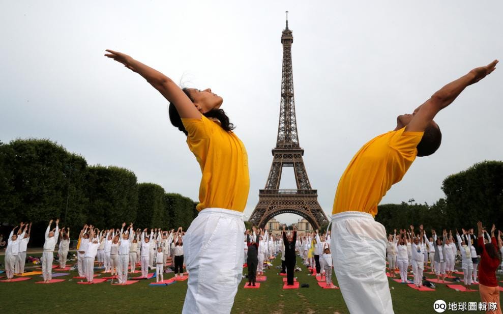 巴黎人出了名的喜歡做瑜珈,圖為 2018年6月人們在巴黎鐵塔前一起做瑜珈的照片。