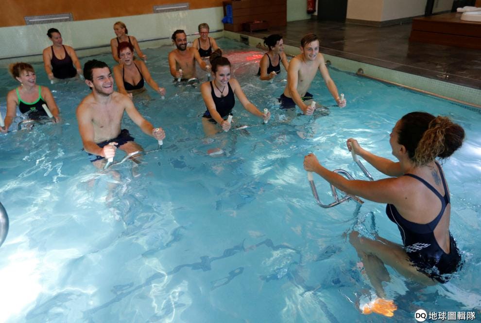 除了踩室內飛輪,來到法國吉倫特省還可以在游泳池中踩飛輪,這種新穎的健身方式頗受好評。